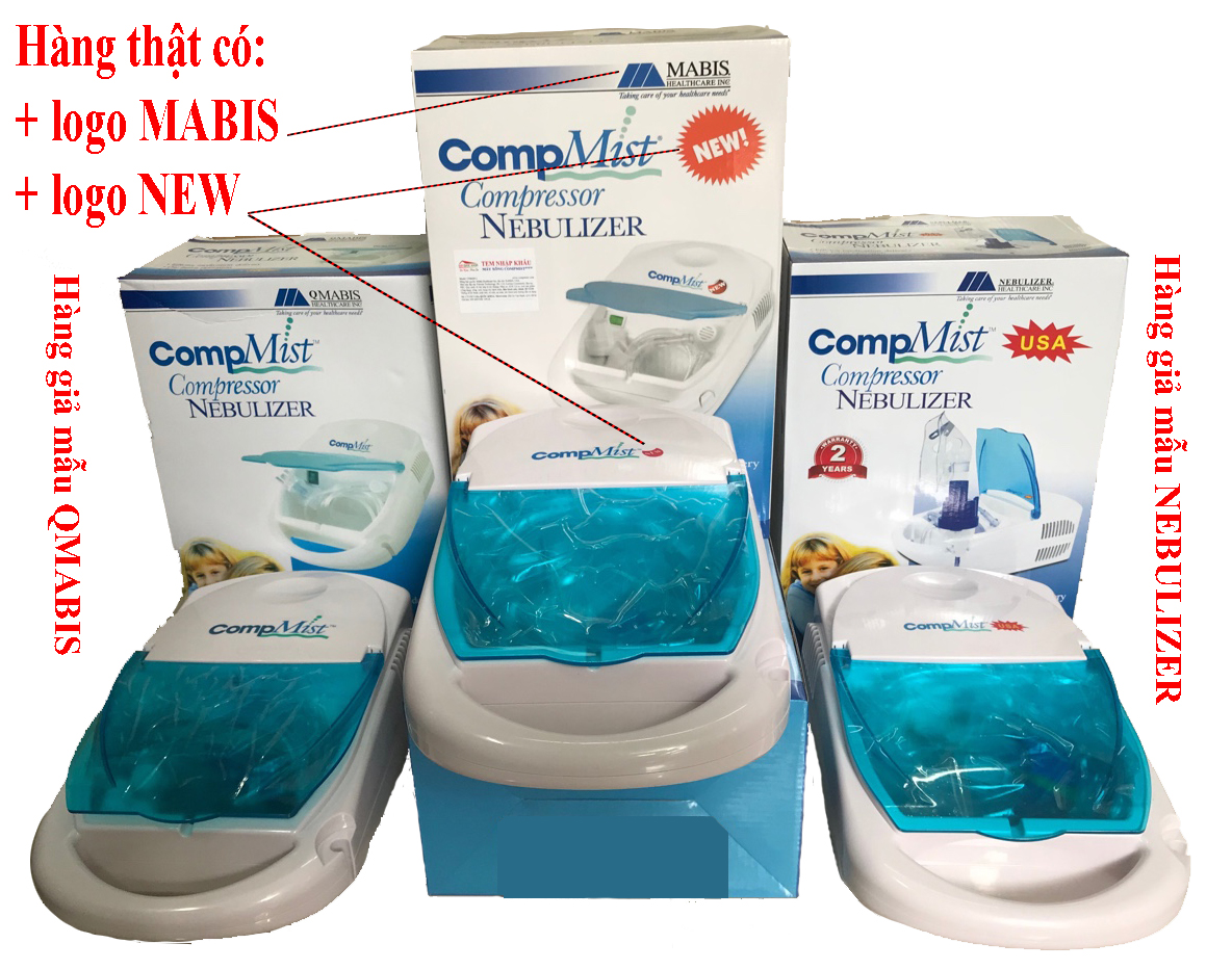 + Máy chính: hàng giả không có logo MABIS kèm slogan "Taking care of your healthcare needs" trên hộp. Thường dùng chữ khác như QMABIS hay NEBULIZER để nhái thương hiệu MABIS chính hãng.